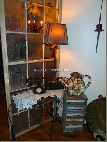Your style and mine are very close. I love what you did with the window. I have old windows in my basement waiting for projects. Ditto on the high-back queen and wing chairs, I love them (stashed away 7 already!) I prefer old chairs to couches anyday!