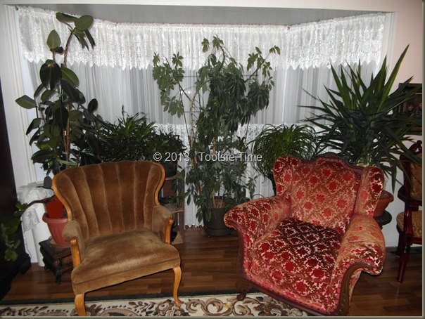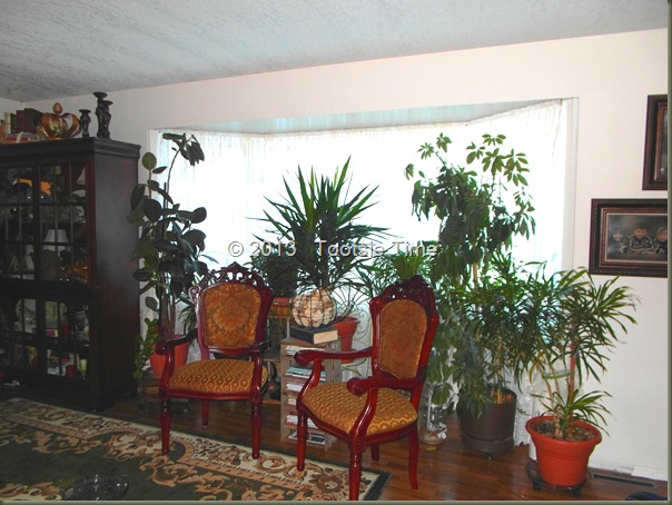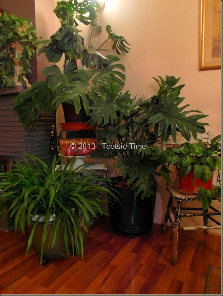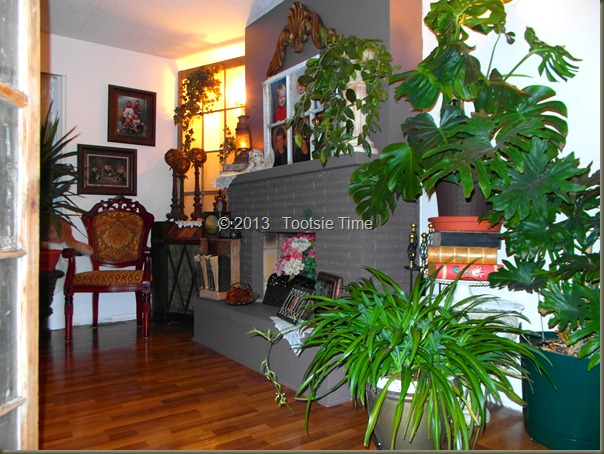 I shuffled things around and around and around…until I think I got it just right…at least for now.  I had to bring a bunch of plants in from the greenhouse this week, as it is planting season, and I am running out of space…so the tropicals have to move into the house for a few months…This is hard to deal with, as this house does not offer a lot of good lighting for plants.   They suffer just a little bit in here…but they bounce back right after I get them back out to the greenhouse…so I think I can stand to have them inside for a bit.